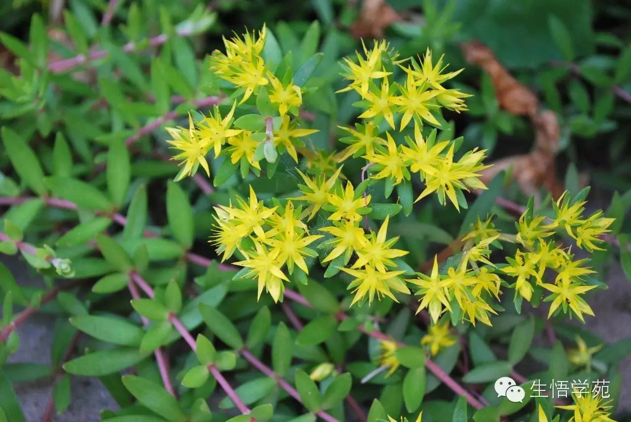 你看它的花,五角星型,這種軸對稱讓每個花瓣之間都呈現72度夾角。連雄蕊都呈現統一姿態?;m不大,但是沿路鋪出的垂盆草同時開放這多五星黃花還是蠻炫滴!